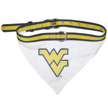 West Virginia University 100% cotton dog bandana embroidered with the team logo. This bandana is attached to color striped nylon web collar with silver grommets and hardware.
